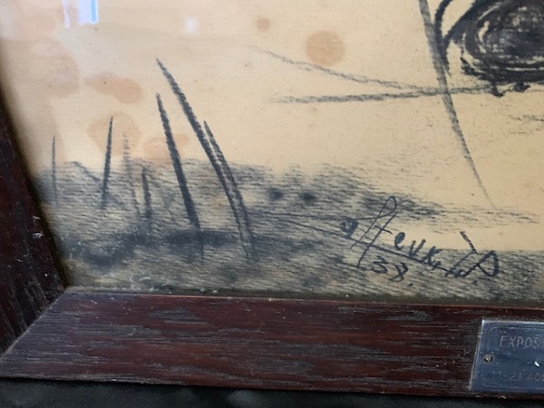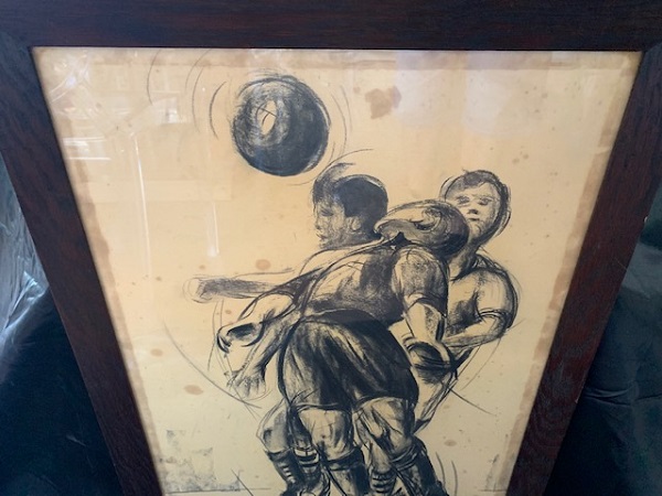 dessin au fusain : joueurs de football, signature en bas à gauche, datée 1938 - Plaque apposée sur le cadre mentionnant l'exposition de l'œuvre à Schifflange à l'occasion de l'exposition Jean Jacoby "Arts et Sports" du 11 au 21 août 1938, 1er prix de dessin