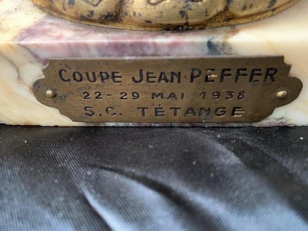 Remise de prix sportif en marbre jaune de Sienne et cuivre , mention " Coupe Jean PEFFER , 22-29 Mai 1938, S.C. Tétange "