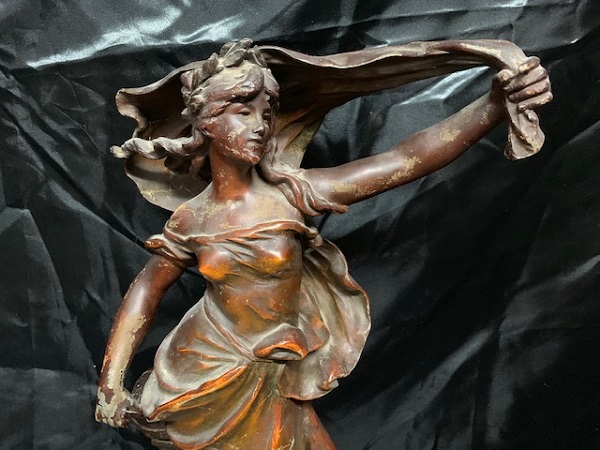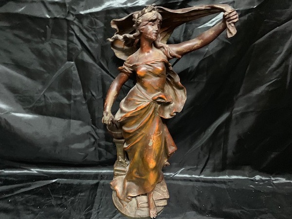 Statue en régule, signée Auguste MOREAU (1834-1917), allégorie aux instruments scientifiques (compas, globe terrestre, livre, thermomètre et cornue) - Quelques défauts de patine, socle absent .